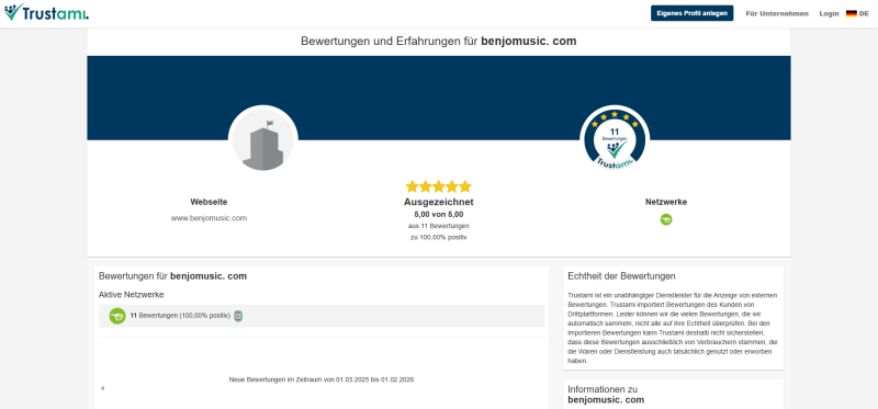 Entdecken Sie, warum unsere Kunden von unseren Produkten und unserem Service begeistert sind. Bei benjomusic.com legen wir Wert auf Qualität, faire Preise und exzellenten Kundenservice. Lesen Sie selbst, was unsere Kunden über uns sagen und warum sie uns weiterempfehlen!